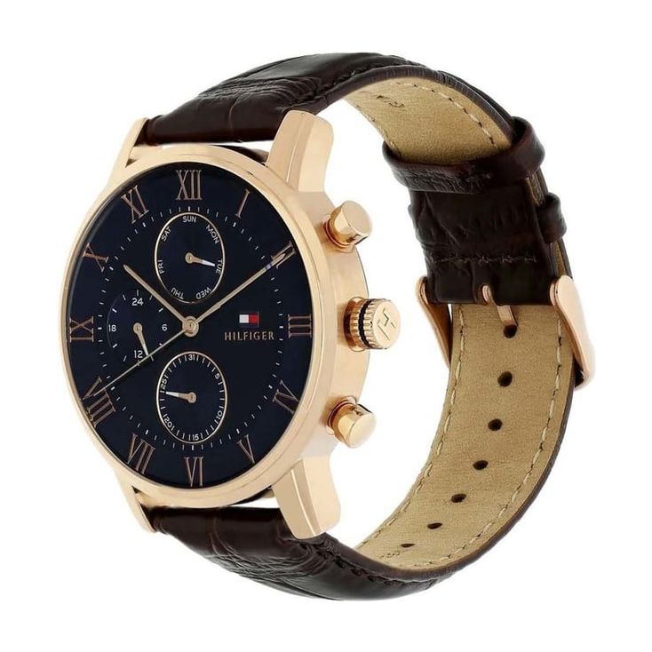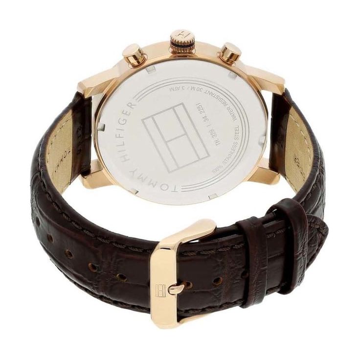 Infuse class to your attire with this analog watch from the Kane collection by Tommy Hilfiger. The round dial is nestled in a 44 mm case. It exhibits a crown for time adjustment. The genuine leather strap exudes a subtle hue that accentuates the look of the watch.