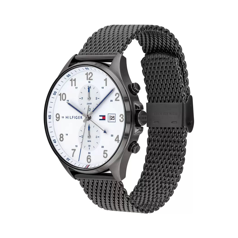 Look stylish and elegant by wearing this men's analog watch from the West collection by Tommy Hilfiger. Its stainless steel strap showcases a steel grey hue that uplifts the look of the watch. The white round dial is nestled in a 44 mm case and is secured by a mineral...