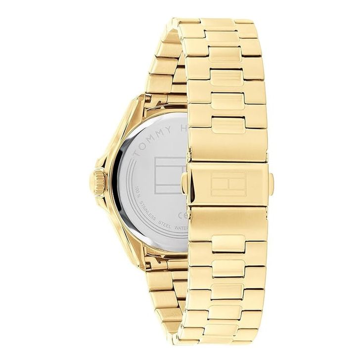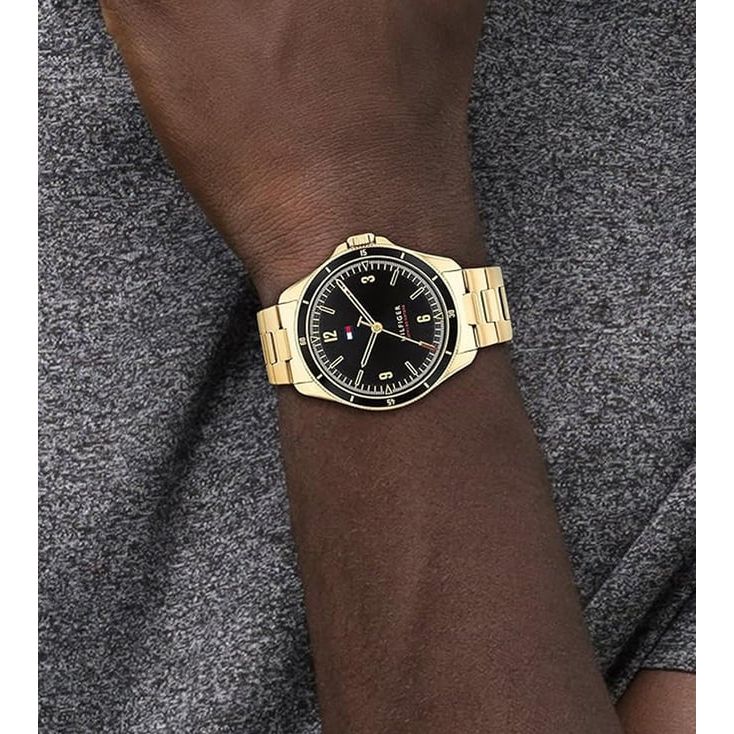 Amaze everyone around you by wearing this men's Analog watch from the collection by TOMMY HILFIGER. The black round dial is protected by a Sapphire Glass. It features a crown for time adjustment. The stainless steel strap comes in a gold hue that further elevates the look of the timekeeper....