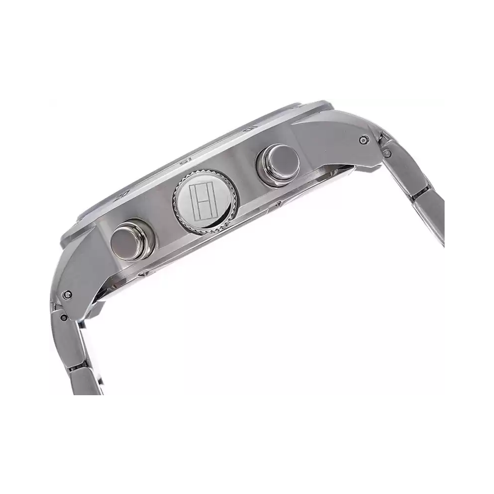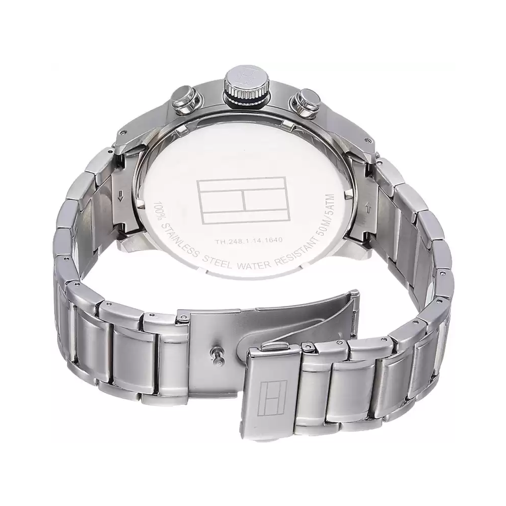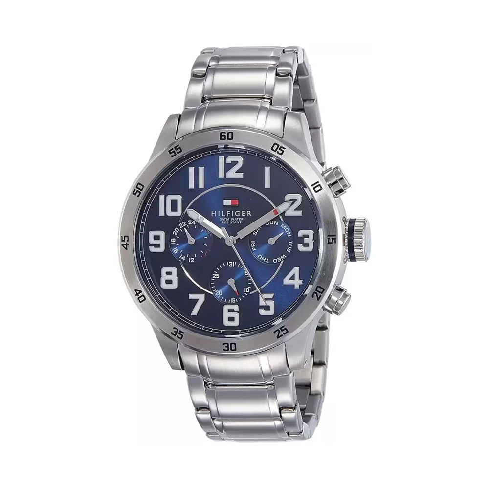 Set your fashion parameters high with this men's analogue watch from Tommy Hilfiger. Protected by mineral glass, the navy round dial is housed in a 44 mm case. It exudes plain three hands and a crown for time adjustment. The stainless steel strap vaunts a silver hue that enhances the look of the watch. Moreover, it is fitted with a push-button clasp that ensures a secure fit on the wrist.