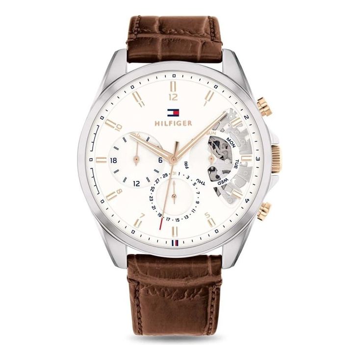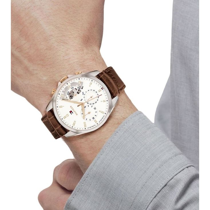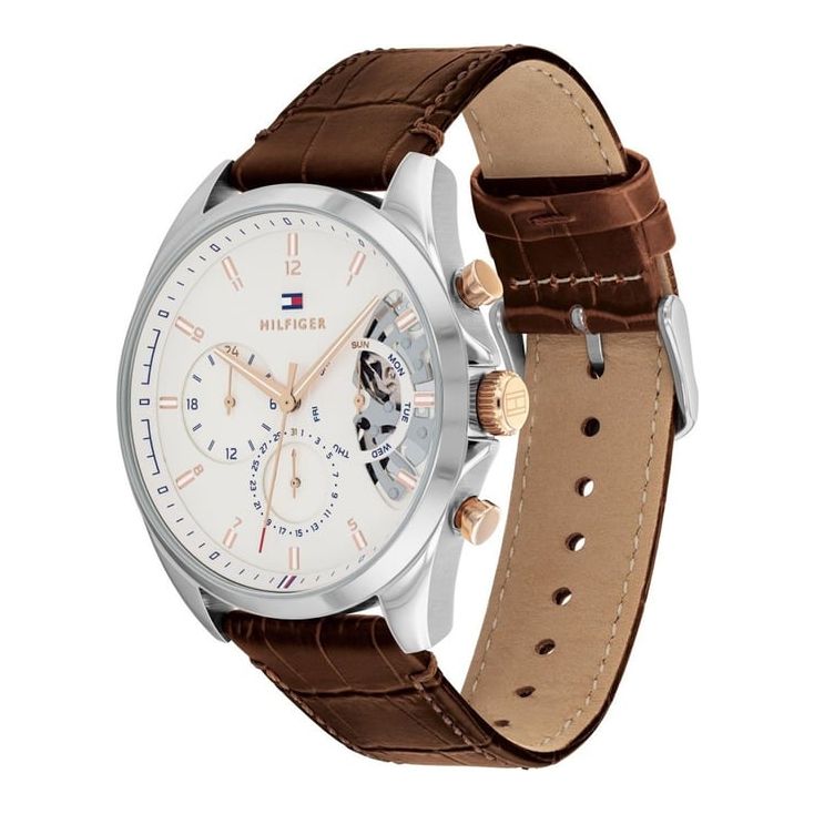 Style and performance perfectly combine together to form this analog watch that is brought to you by the Baker collection from Tommy Hilfiger. Operated by a quartz movement and safeguarded by a mineral glass, the round dial is encased in a 43.5 mm case. It features multifunction functionality and a...