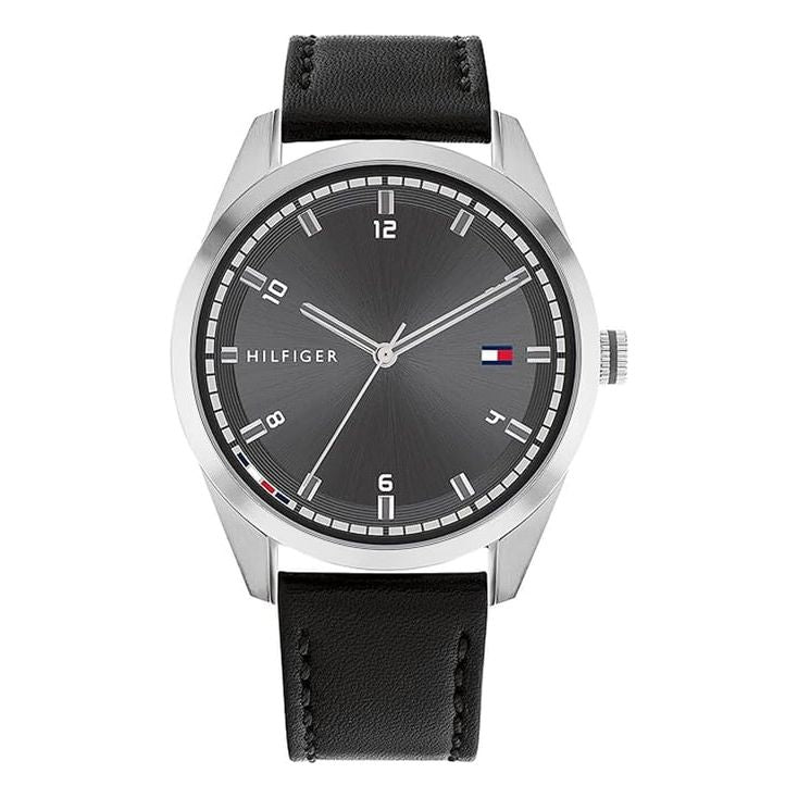 Amaze everyone around you by wearing this men's Analog watch from the collection by TOMMY HILFIGER. The grey round dial is protected by a Sapphire Glass. It features a crown for time adjustment. The genuine leather strap comes in a black hue that further elevates the look of the timekeeper....