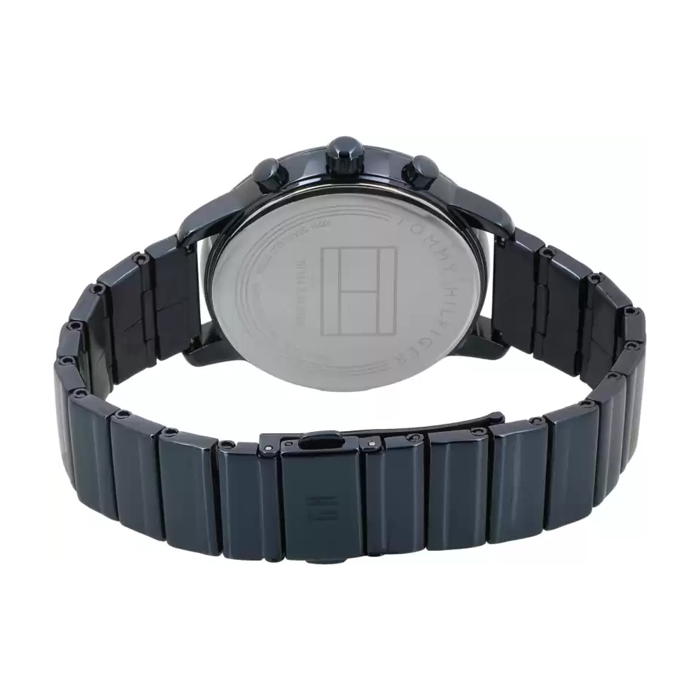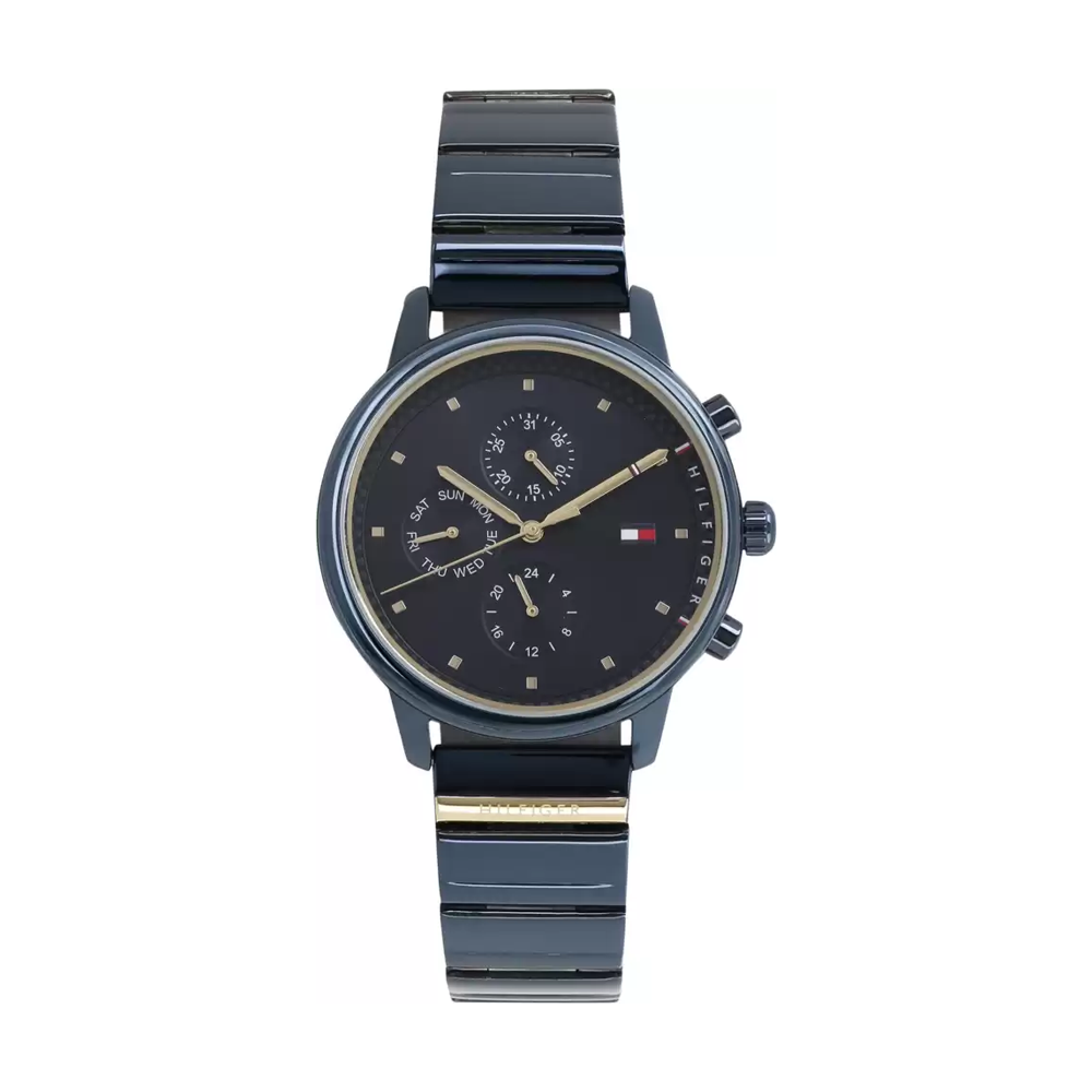 Upgrade your accessory collection with this women's analog watch from Tommy Hilfiger. The navy round dial features plain three hands, hour markings at five-minute intervals, three subdials, two pushers and a crown for time adjustment. Besides, the stainless steel strap also vaunts a navy hue that enhances the look of...