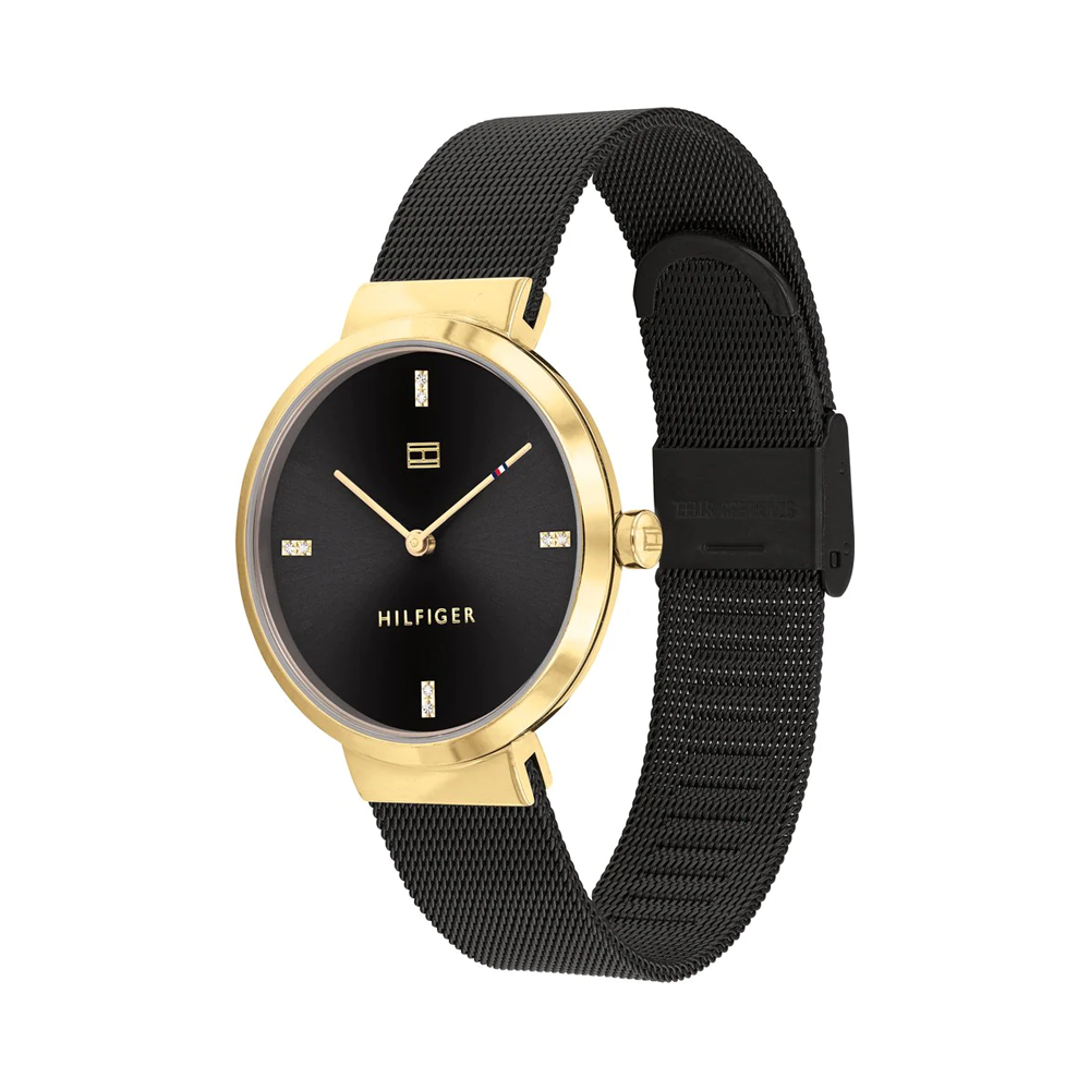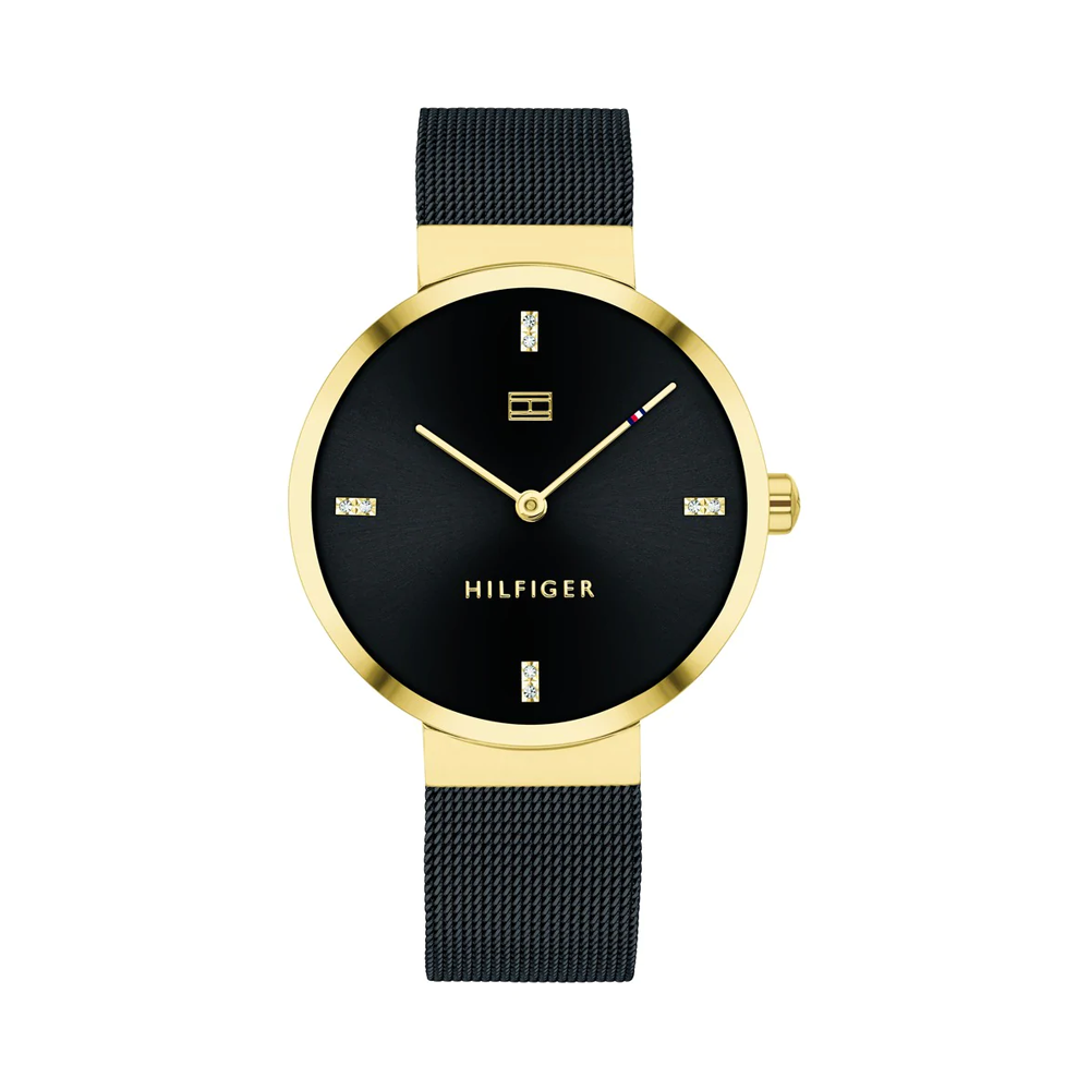 For an understated yet impactful style statement, pick this women's analog watch from the Liberty collection by Tommy Hilfiger. Its stainless steel strap vaunts a black hue that enhances the look of the watch. Housed in a 35 mm case, the black round dial looks absolutely stunning. It exudes plain...