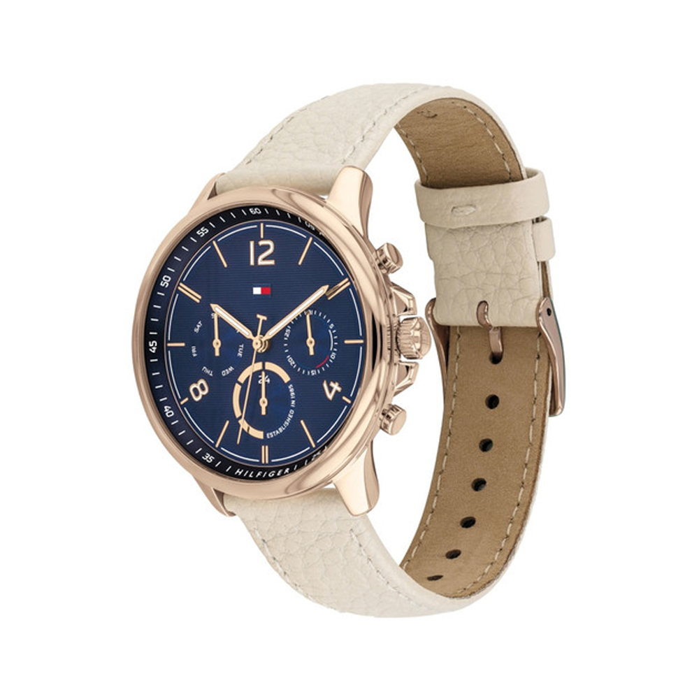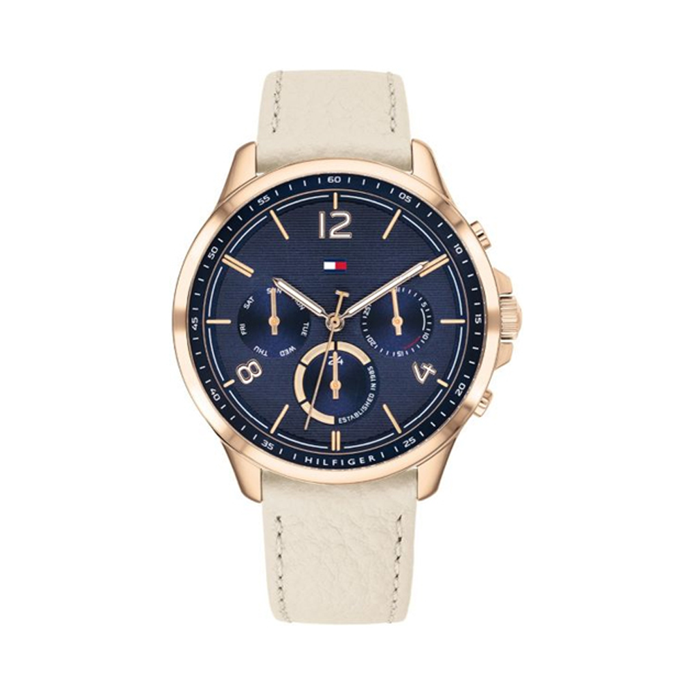 Add a tinge of style to your look with this women's analog watch from Tommy Hilfiger. Its genuine leather strap flaunts a beige hue that accentuates the look of the watch. The navy round dial is protected by a mineral glass and is functional on a quartz movement. It showcases...