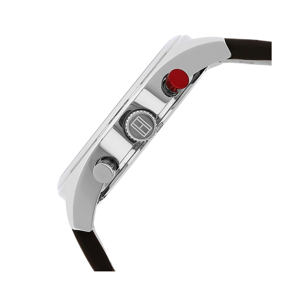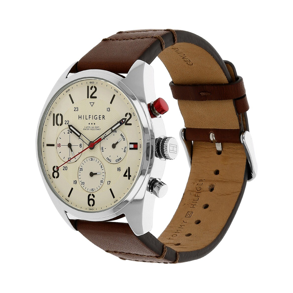 It is time to jazz up your look with this stylish men's analog watch from Tommy Hilfiger's Sport collection. Protected by a mineral glass, the cream round dial vaunts plain three hands, a crown, three subdials, Arabic numerals and slanted marks alternatively at five-minute intervals. Made of genuine leather, the brown strap is equipped with a buckle closure to ensure a proper fit on the wrist. Wear this water-resistant timekeeper with a round neck T-shirt to look dapper.