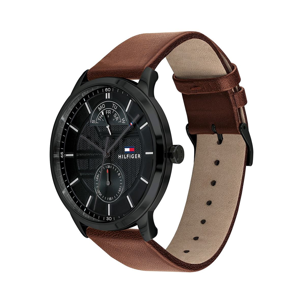 Enrich your accessory collection owning this men's analog watch from the Hunter collection by Tommy Hilfiger. Functional a quartz movement, the black round dial showcases plain three hands, bold stick markings at five-minute intervals, two subdials and a crown for time adjustment. Its genuine leather strap showcases a brown hue that uplifts the look of the watch.